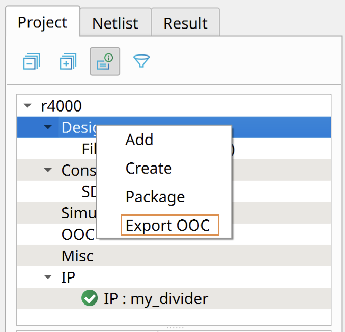 You can export design files and IP cores as an OOC archive. Right-click the Design category or the IP core name in the Project pane and choose Export OOC from the pop-up menu.