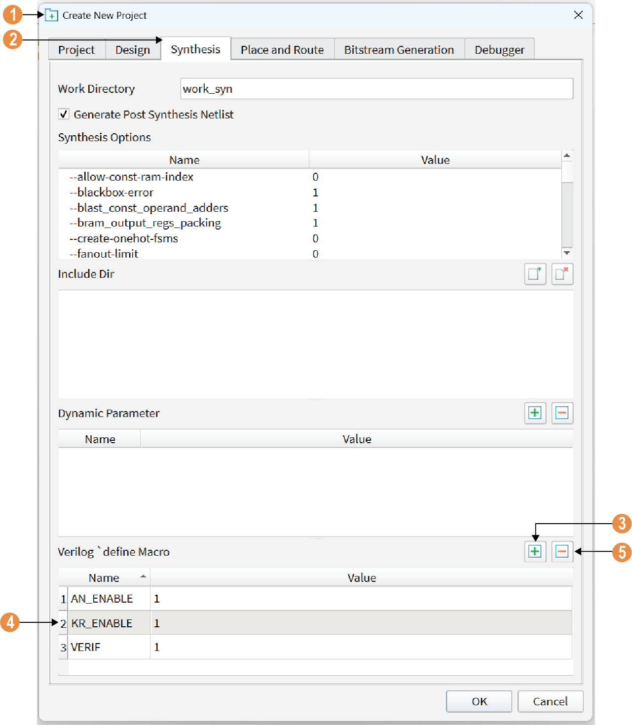 - To disable a macro, you have to remove it from the Verilog define Macro section. To remove a macro, select the desired macro and click -.