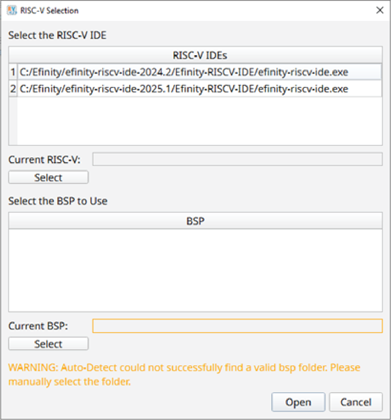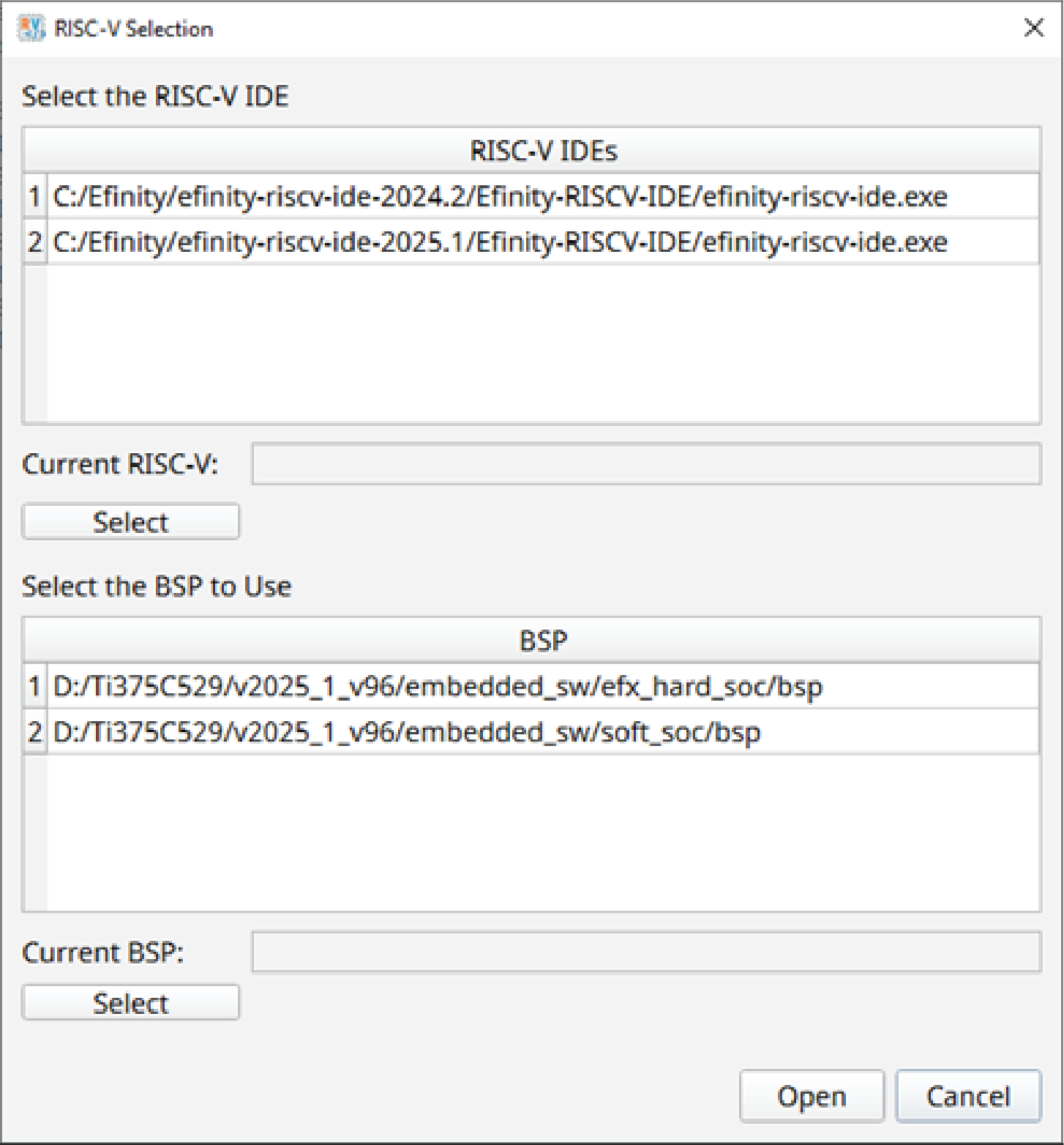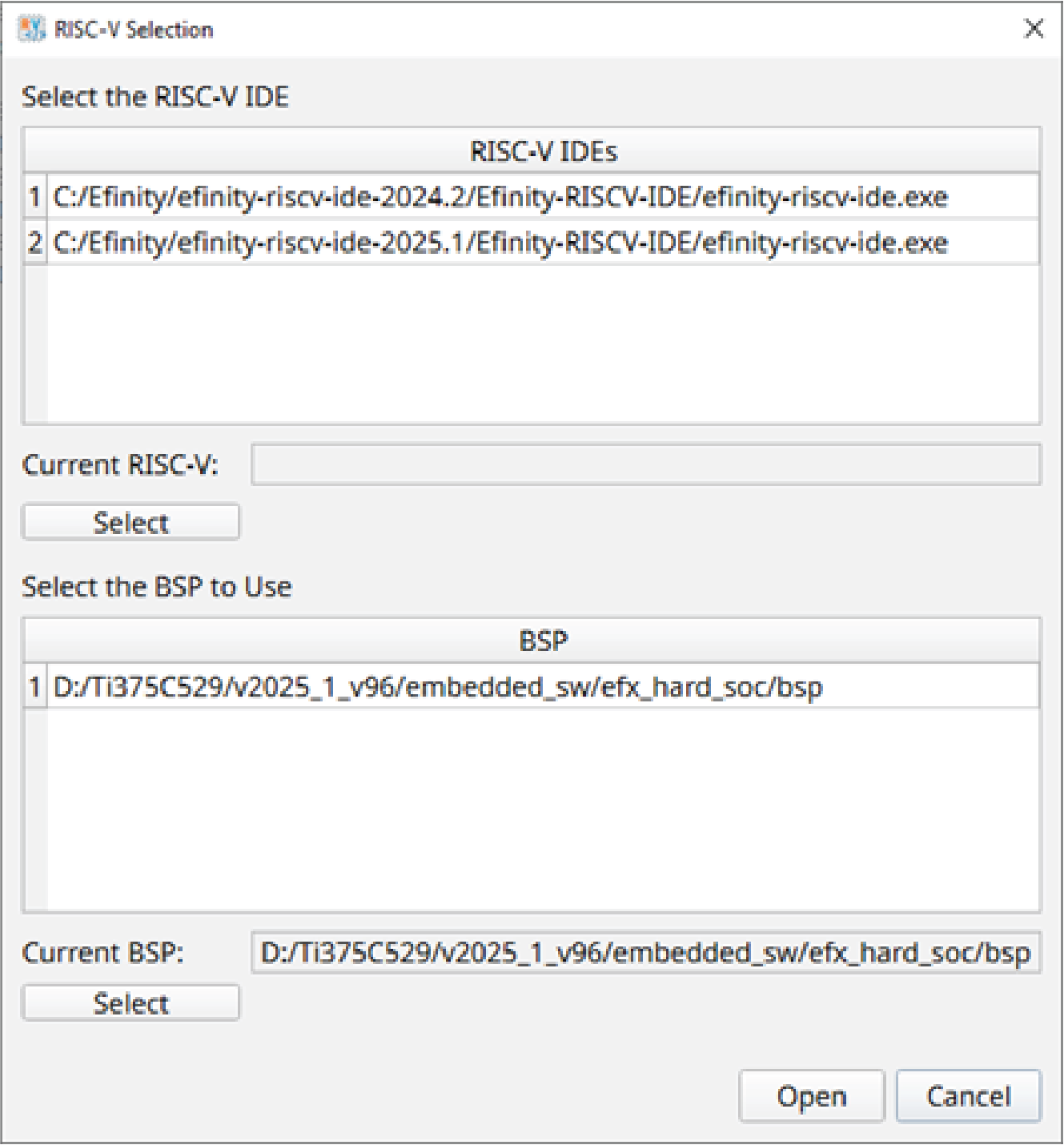 Starting from v2025.1, you can launch the RISC-V IDE from Efinity itself. This feature allows you to easily set-up the workspace and bsp automatically.