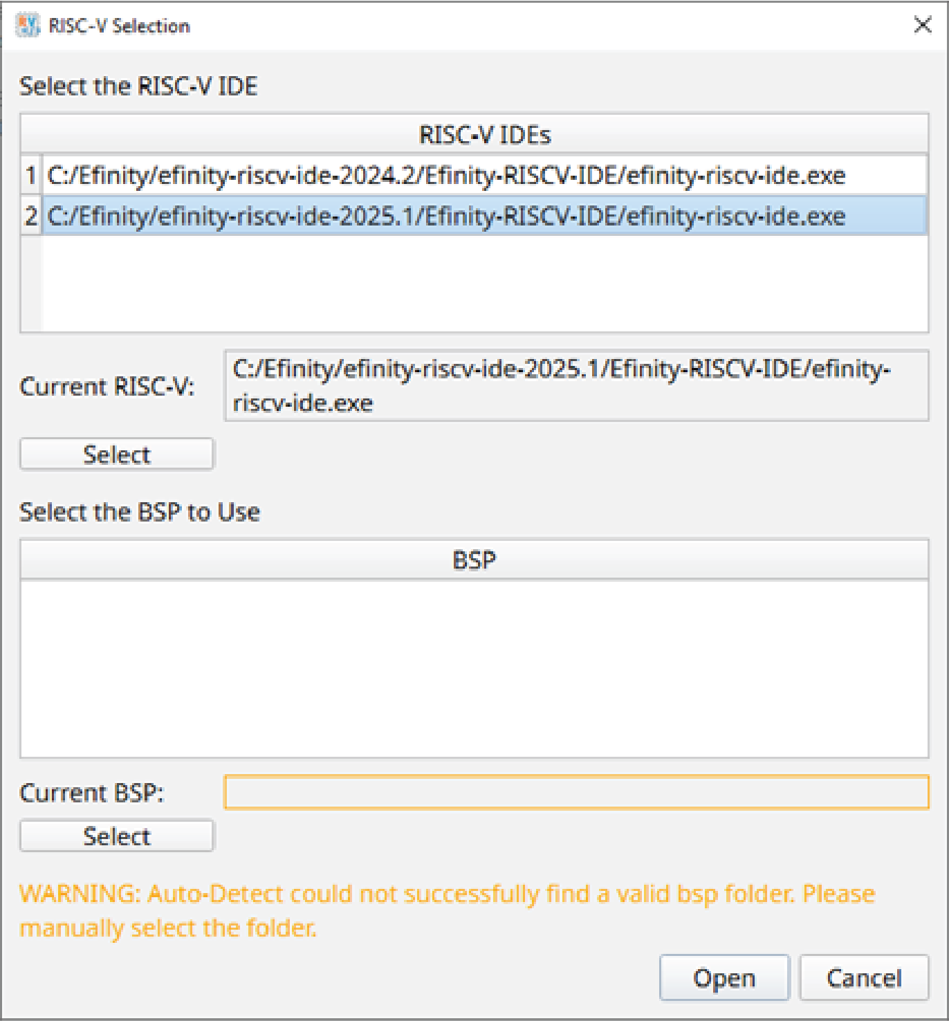 Starting from v2025.1, you can launch the RISC-V IDE from Efinity itself. This feature allows you to easily set-up the workspace and bsp automatically.