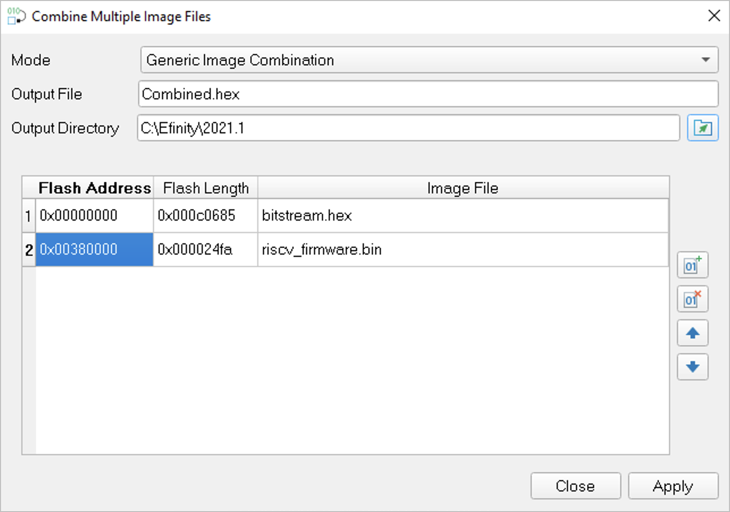 - Click Apply. The software creates the combined .hex file in the specified Output Directory (the default is the project outflow directory).